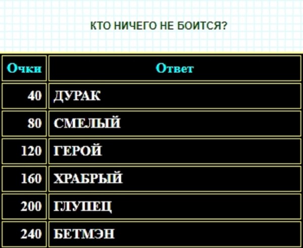 На вопрос про то, кто ничего не боится, только такие варианты будут считаться верными, так как они были наиболее часто упоминаемыми пользователями: